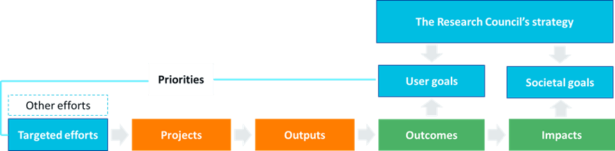 The investment goals consist of societal goals and user goals based on the criteria from the Norwegian Agency for Public and Financial Management.[2] The measures initiated by the Research Council shall result in expected outcomes and societal impacts that are in accordance with an intervention logic model. See Appendix 1 for a presentation of this portfolio's investment logic model.