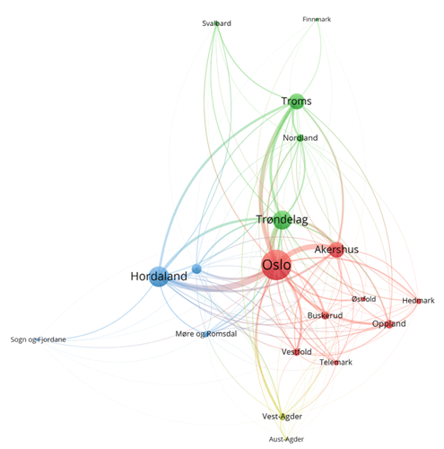 Figur 6.II viser samarbeidsmønstrene mellom fylkene basert på data over medforfatterskap i 2018 (se for øvrig kapittel 6.3 for nærmere informasjon om denne indikatoren). Her representerer sirklenes størrelse antall samarbeidsartikler totalt og bredden på strekene antall samarbeidsartikler mellom de ulike fylkene. De ulike fargene indikerer grupperinger av fylker som har relativt mer samarbeid med hverandre enn med de øvrige fylkene. Figuren illustrerer at det nasjonale samarbeidet har en geografisk dimensjon i form av fylker som er lokalisert i samme landsdeler. Det er imidlertid også samarbeid på tvers av fylker i ulike landsdeler. Mange av fylkene har sterk forbindelse til Oslo, noe som er naturlig gitt at Oslo er det største fylket i publiseringsvolum.