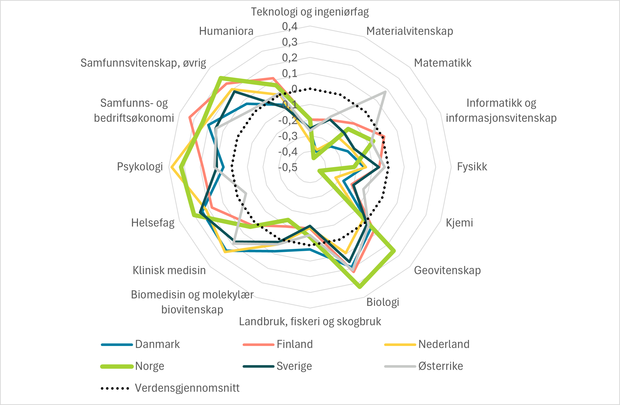 Norge har spesielt få publikasjoner innen kjemi og materialvitenskap, der spesialiseringsindeksen vår er sterk negativ (-0,43 i begge fag). Situasjonen for kjemi er også omtalt som bekymringsfull i den siste evalueringen av naturvitenskap i Norge. Men også i biomedisin og molekylær biovitenskap, fysikk, matematikk og teknologi og ingeniørfag, er spesialiseringsindeksen klart negativ (i intervallet -0,14 til -0,19). Innenfor fire fagfelt (humaniora, informatikk og informasjonsvitenskap, klinisk medisin og landbruk, fiskeri og skogbruk [2]) avviker ikke Norges spesialisering spesielt fra verdensgjennomsnittet.