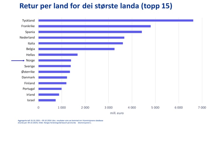 Norske forskarar og bedrifter er på 8. plass av totalt 140 land når det gjeld å hente pengar frå verdas største forskings- og innovasjonsprogram, Horisont Europa. Målt i forskarårsverk, er Noreg det landet som har konkurrert seg til mest EU-pengar.