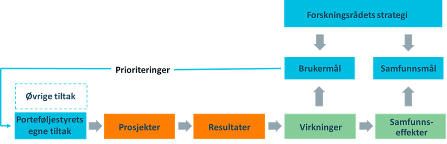 Investeringsmålene er forankret i Forskningsrådets strategi og består av samfunnsmål og brukermål.[2] De tiltak som settes i gang av Forskningsrådet, skal resultere i noen forventede virkninger og samfunnseffekter i henhold til en investeringslogikk (se figur 1). Se vedlegg 1 for en oversiktlig fremstilling av denne porteføljens investeringslogikk.