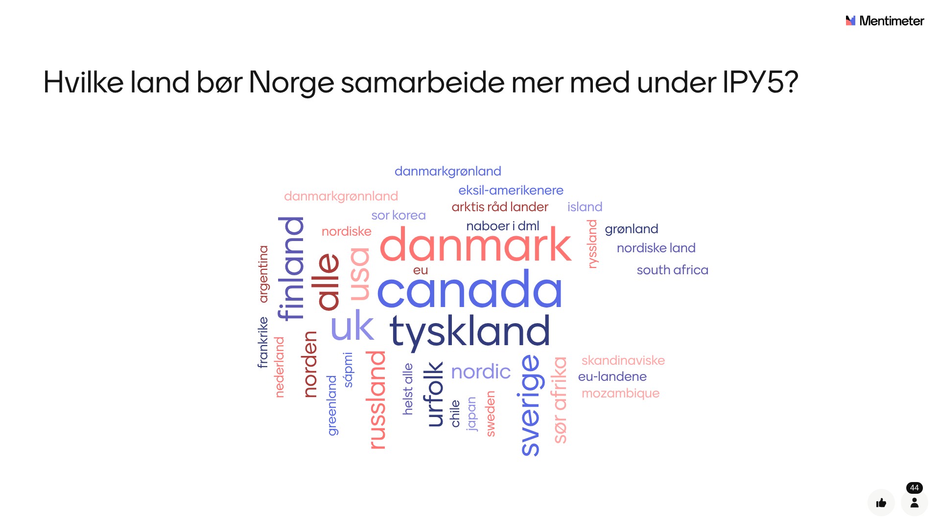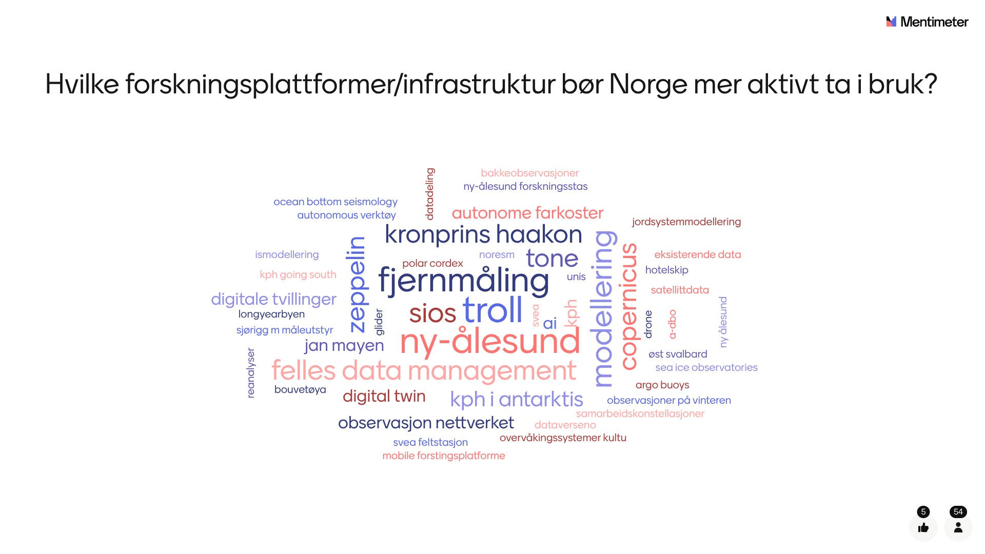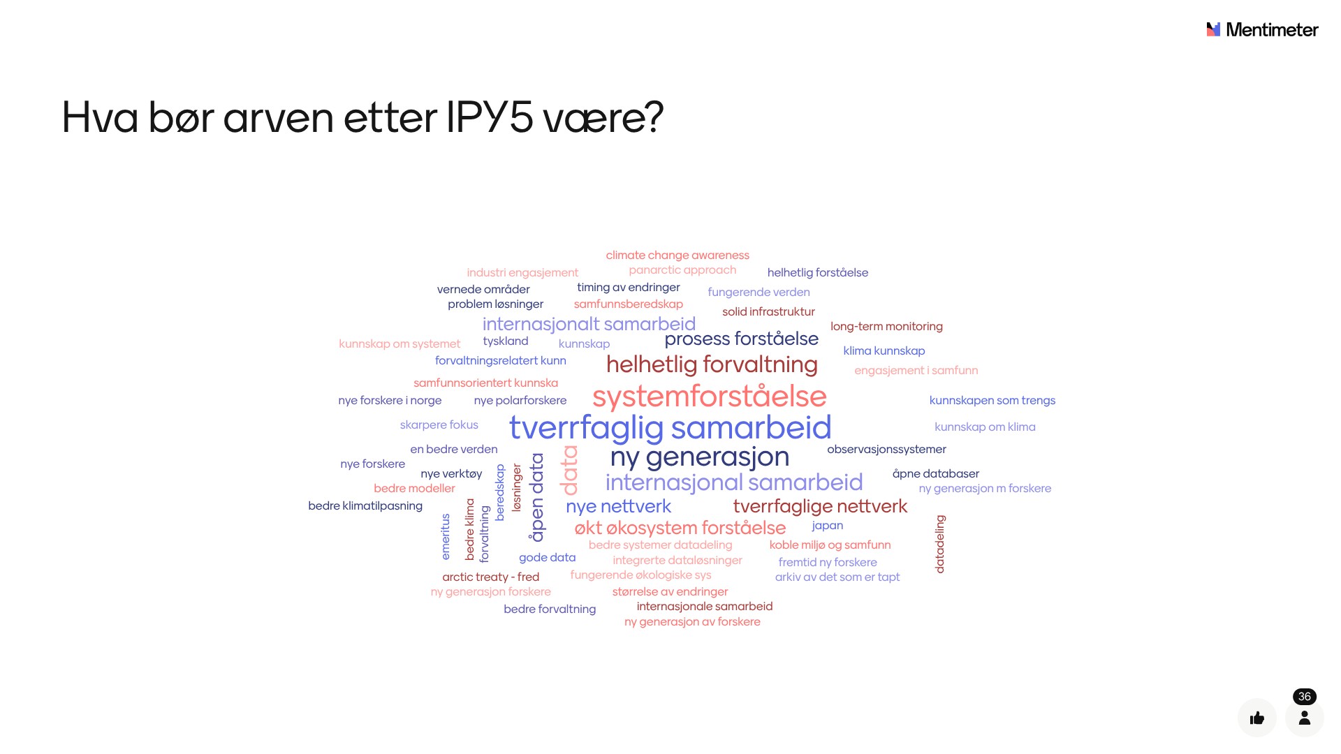 Deretter ble det åpnet for innspill gjennom responsverktøyet Mentimeter, hvor deltakerne bidro med mange gode idéer og refleksjoner rundt veien frem til IPY5. Resultatet ser du i ordskyene under.