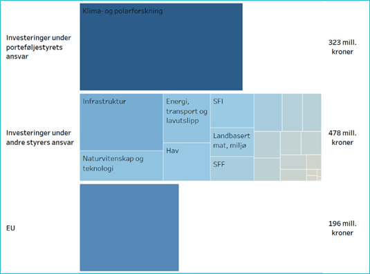 Figur 3 viser at porteføljen for klima- og polarforskning i Forskningsrådet og bidrag fra EU utgjorde totalt nærmere 1 mrd. kroner i 2021. Om lag 32 prosent (323 mill. kroner) er porteføljestyrets egne investeringer, mens 48 prosent (478 mill. kroner) er investeringer gjort gjennom andre porteføljer i Forskningsrådet. De største investeringene er fra Infrastruktur, Naturvitenskap og teknologi, Energi, transport og lavutslipp, Hav, SFI, Landbasert mat, miljø og bioressurser og SFF. 20 prosent (196 mill. kroner) er fra EUs rammeprogram.
