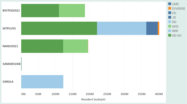 Figur 3 viser finansieringskildene for FoUoI-innsatsen i 2021 i prosjekter som var finansiert gjennom budsjettformålene som Porteføljestyret for muliggjørende teknologier har ansvaret for. BIOTEK2021, IKTPLUSS, NANO20021 og SAMANSVAR er porteføljestyrets investeringsmidler, dvs. de strategiske midlene som porteføljestyret anvender for å nå målene i porteføljeplanen. SIMULA er øremerkede midler fra hhv. Kunnskapsdepartementet (KD) og Kommunal- og distriktsdepartementet (KDD) som porteføljestyret ikke kan påvirke innretningen av. Fra 2022 er midlene i budsjettformålet SAMANSVAR lagt inn i det nye budsjettformålet TEKNOKONVERGENS.