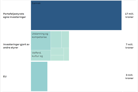 Figuren viser at porteføljestyret for samisk egne investeringer står for om lag 62,9 % av porteføljen. Foreløpige tall viser at de største bidragene fra andre sine investeringer kommer fra porteføljen for Velferd, kultur og samfunn, og EU.